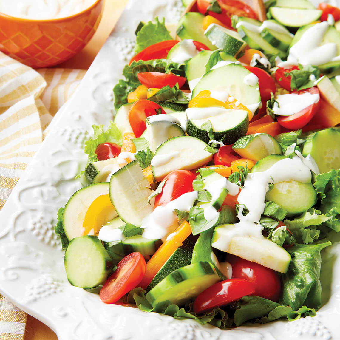 For the salad: In a medium bowl, toss together cucumber, tomatoes, bell pepper, and zucchini. Distribute lettuce leaves among salad plates. Spoon vegetable mixture on top of lettuce. Garnish with torn basil leaves. Serve with goat cheese dressing.