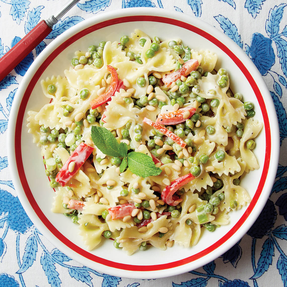 For the salad: Place cooked pasta in a large mixing bowl. Pour prepared dressing over pasta; toss until coated. Add peas, bell pepper, onions, mint, and pine nuts. Place in an airtight container and refrigerate for at least 2 hours before serving.