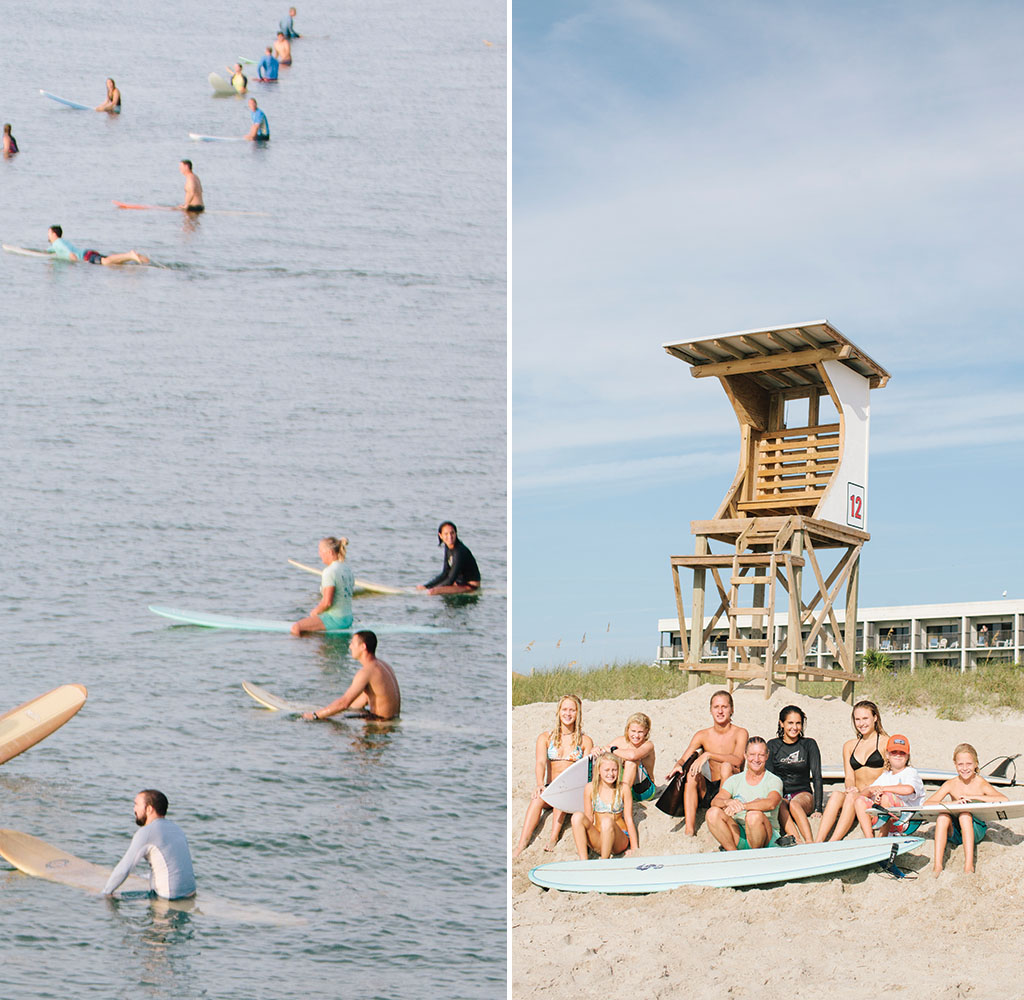 Jo taught herself to surf and recalls the joy of catching that first wave: “That’s the moment. And that’s why I still want to teach.” Current and former students share waves with her at Wrightsville Beach. photograph by Millie Holloman Photography