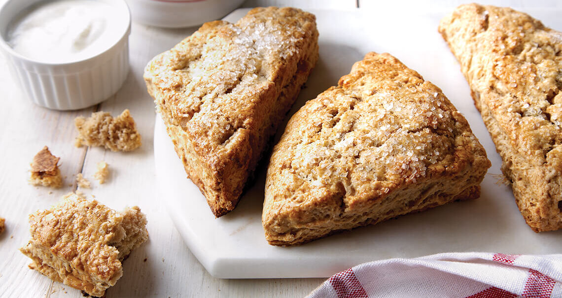 Bake the scones for 18 to 22 minutes on the top rack, rotating the baking sheet after 14 minutes, until they’re light gold and slightly firm to the touch. Remove the scones from the oven and serve warm or at room temperature.