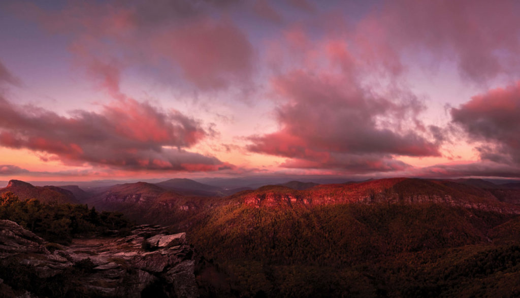Sometimes called “the Grand Canyon of North Carolina,” Linville Gorge — here, with Hawksbill Mountain — spans more than 10,000 acres of virgin forests; no industrial logging ever took place here. Of the four major gorges in the state, Linville Gorge is the only one without a road in the bottom. photograph by Tommy White
