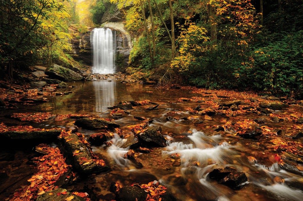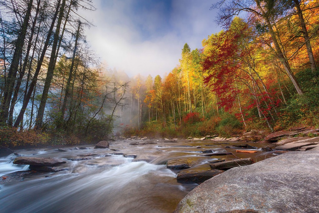 A misty autumn morning at High Falls in Transylvania County, where the Little River nears a 125-foot drop. photograph by dezignhorizon.com/Brendan Arcuri