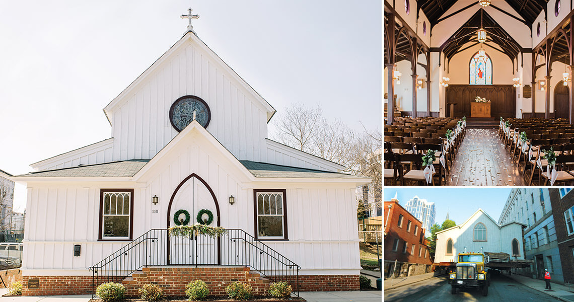 The Free Church of the Good Shepherd held the first service in its new building on Easter Sunday in 1875. Now known as All Saints Chapel, it was designed by the Rev. Johannes A.S. Oertel — a Bavarian immigrant, Episcopal priest, and artist — in the Carpenter Gothic style. The church was moved twice: to the rear of its original property on Hillsborough Street in 1899, when the congregation built a larger sanctuary, and then to South East Street in 2006, when the chapel was saved from demolition and restored for use as a wedding and event venue. Couples walk down the aisle on original wide-plank pine floors, pass flanking wings featuring Gothic arched windows, and say “I do” beneath a vaulted ceiling, whose exposed roof beams are lighted by lavender-tinted clerestory windows.