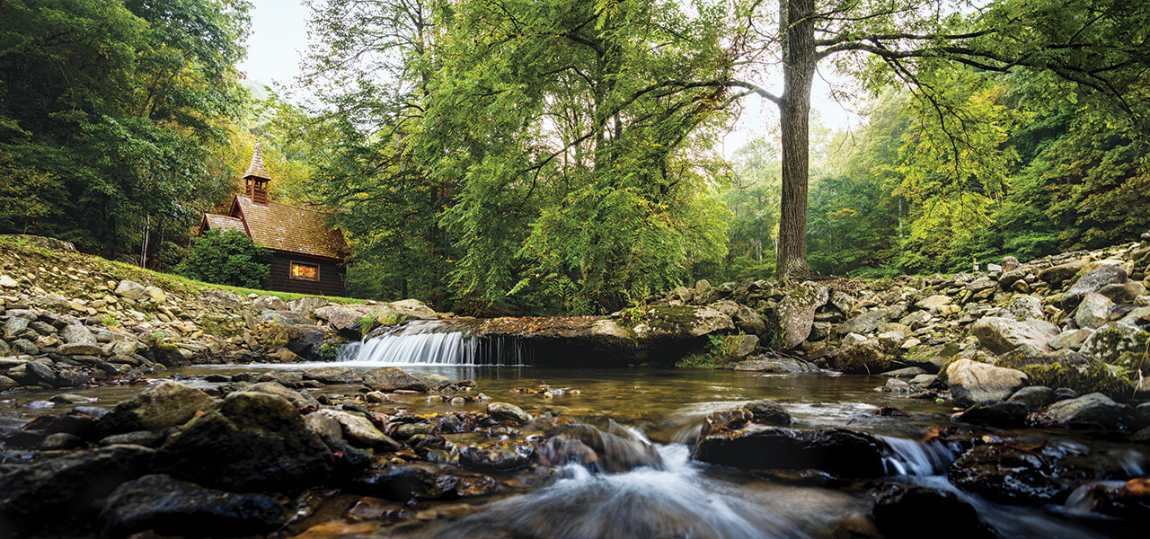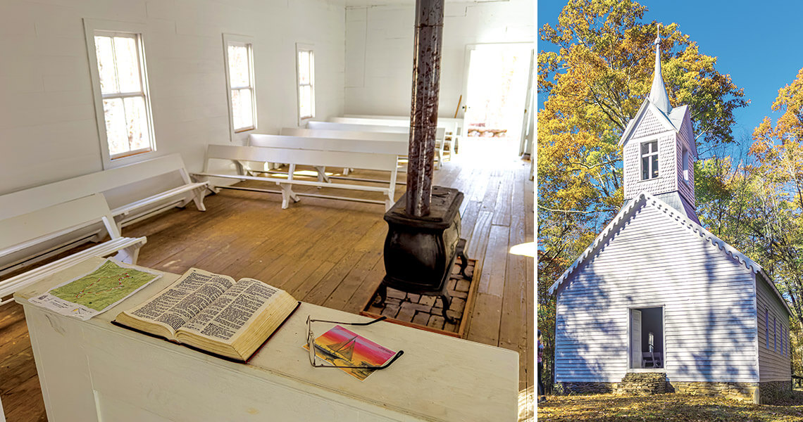 The first known homestead in Cataloochee Valley was built 120 years before the establishment of Great Smoky Mountains National Park. Early settlers logged, farmed, and attended Little Cataloochee Baptist Church, built in 1889. The one-room chapel was heated by a solitary woodstove, and services were informal, with the men often stepping outside to whittle, chew tobacco, and shoot the breeze. Regular services ceased after Cataloochee Valley was abandoned in the 1940s, not long after the creation of the park, but descendants of the former residents still gather at the chapel for reunions. They hold services, decorate the headstones in the graveyard, and share meals. The church can be reached by hiking or riding on horseback along a portion of the roughly five-mile Little Cataloochee Trail, lined with rhododendrons and historic cabins of former Cataloochee Valley residents.