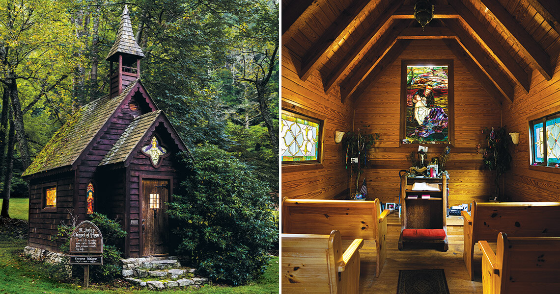 Beyond a small wooden sign with Psalm 121 — “I will lift up mine eyes unto the hills from whence cometh my help” — carved above an invitation to “stop, rest, reflect,” three stone steps rise between two rhododendrons. Through the roughly 180-year-old door that was brought over from England, past the bookcase stacked with free Bibles and notebooks in which visitors sign their names and relay their heartfelt stories, St. Jude’s Chapel of Hope welcomes all who seek solace and a place to commune with God. In front of the prayer bench, the altar overflows with mementos: photos of loved ones, a bottle of holy water from Ethiopia, pet collars, obituaries, and scraps of paper scribbled with prayers.