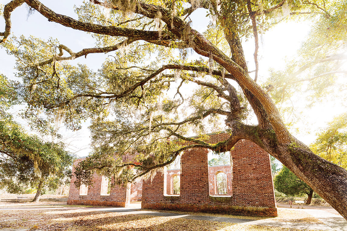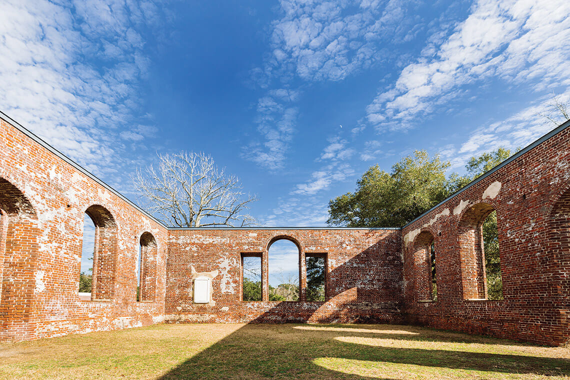 [the church] was so well built that several large-caliber Union naval shells bounced off it,” McKee says. The church has endured major hurricanes and even a direct hit by a tornado in 2020. Although the roof, windows, and interior have been destroyed, the almost three-foot-thick brick walls stand firm, surrounding a once-sacred space that’s now open to the heavens.
