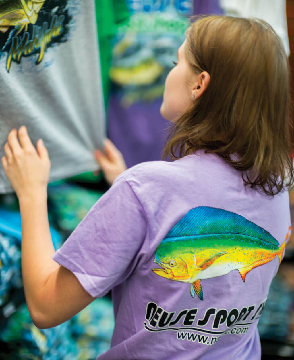 Russell Rhodes, Neuse Sport Shop’s president, also designed the store’s T-shirts, which are ubiquitous across eastern North Carolina. They represent a lifestyle, he says, but also, “it doesn’t hurt that they’re $8.” photograph by Charles Harris