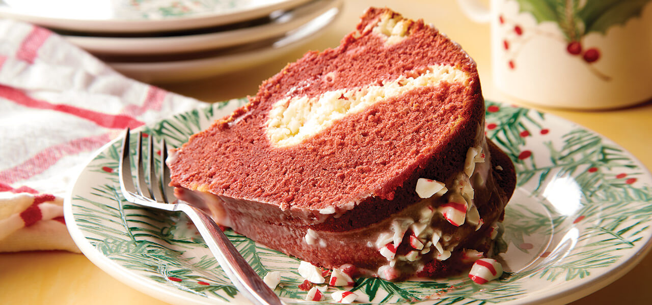 For the glaze: In a small bowl, whisk all ingredients until smooth. Once the cake has cooled completely, drizzle glaze over cake. Sprinkle top of cake with crushed peppermint candies.