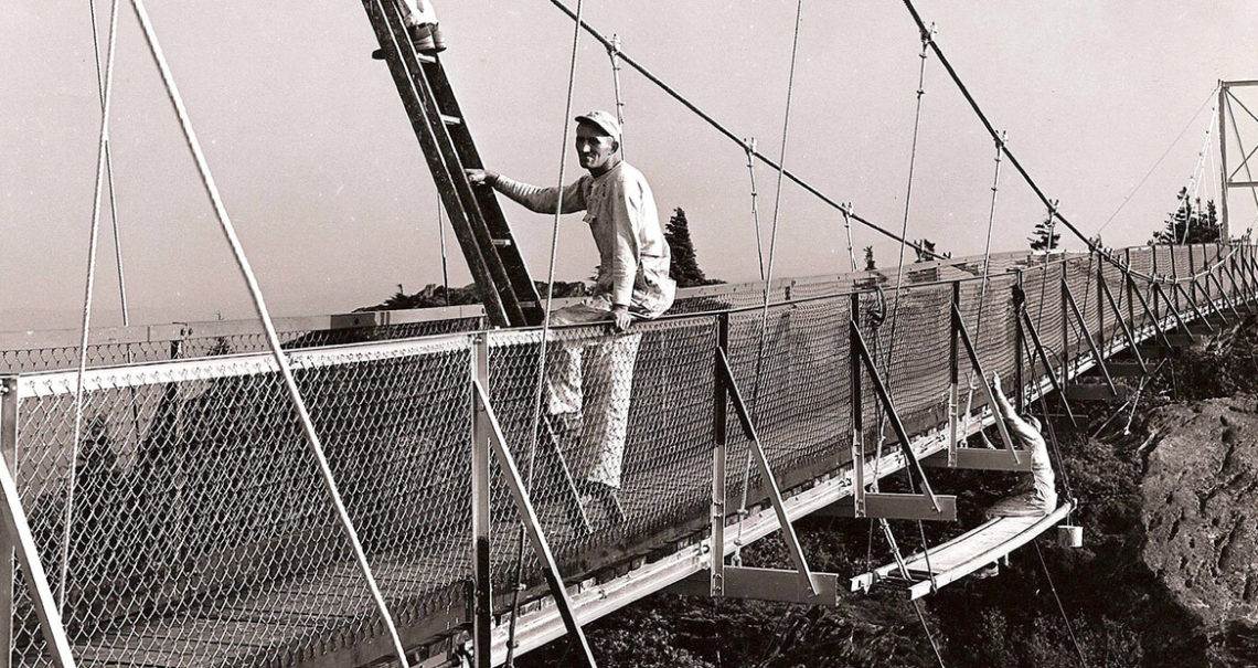 Morton envisioned a 228-foot suspension bridge to span the 80-foot chasm between Grandfather’s Convention Table Rock and Linville Peak. He hired Charles Hartmann Jr. of Greensboro to draw up designs. Morton hoped the structure would afford people of all physical abilities the exhilaration of cresting a mountain. When the bridge opened on September 2, 1952, Morton’s grandmother, then 90 years old, was once again allowed the high-altitude views she cherished.