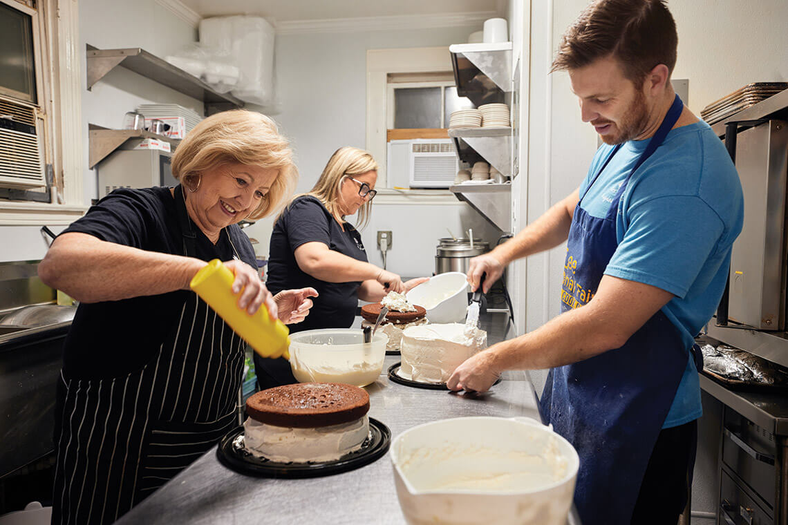 Like any proper tearoom, Mrs. Lacy’s has an abundance of homemade sweets. With his blue “Lee County Cook-Off ” apron tied around his waist, Chad works on one of the stars of the 13-dish dessert menu: Hershey bar cake. He was 14 years old when his grandma first taught him how to bake the layered devil’s food cake finished with white icing and shaved Hershey bars. “After about two or three weeks of a couple failures, burnings, and being extremely slow icing the cakes, I started out doing about two a day,” Chad says. More than 20 years later, he makes 10 cakes in the two and a half hours he spends in the kitchen every morning. “Who else gets to say they’ve spent every day with their grandparents for the past 20 years?” he says. “You learn through example and watching others, and [my grandma] is the perfect example of that. I get to see these people go in and bust their tails every day and earn an honest living.”