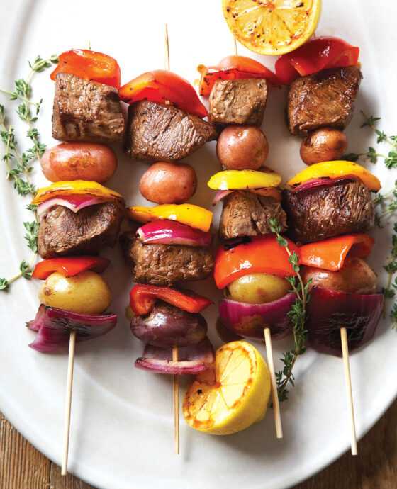 If using wooden skewers, soak them in water for a few minutes. Season steak cubes on all sides with salt and pepper. Thread potatoes, steak, onion, and bell peppers onto skewers and brush with marinade.