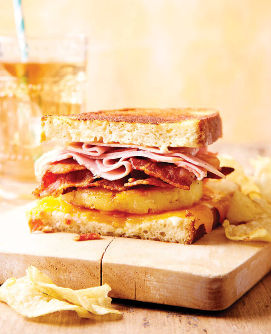 While skillet is heating, spread mayonnaise mixture on all four slices of bread. Layer 2 slices of Cheddar, a slice of pineapple, 4 bacon slices, and 2 ham slices on 2 of the sourdough slices; top with remaining bread.