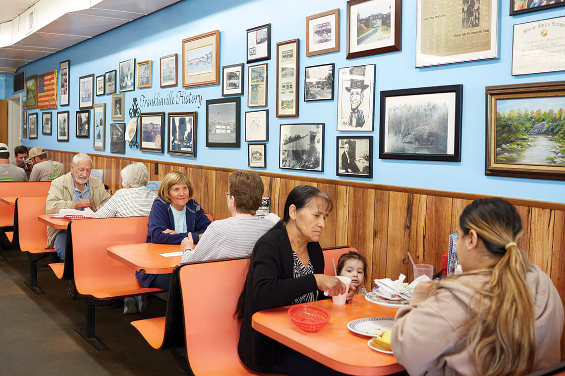 Franklinville Diner’s location in the center of town — steps away from the John W. Clark Public Library and next to the Hanks Masonic Lodge No. 128 — makes it the ideal gathering place for groups like the men’s Monday morning Bible fellowship, firefighters from the local station, birthday parties, and special events. “The town needs this place,” Andrea says, “whether Cliff and I are here or not.”