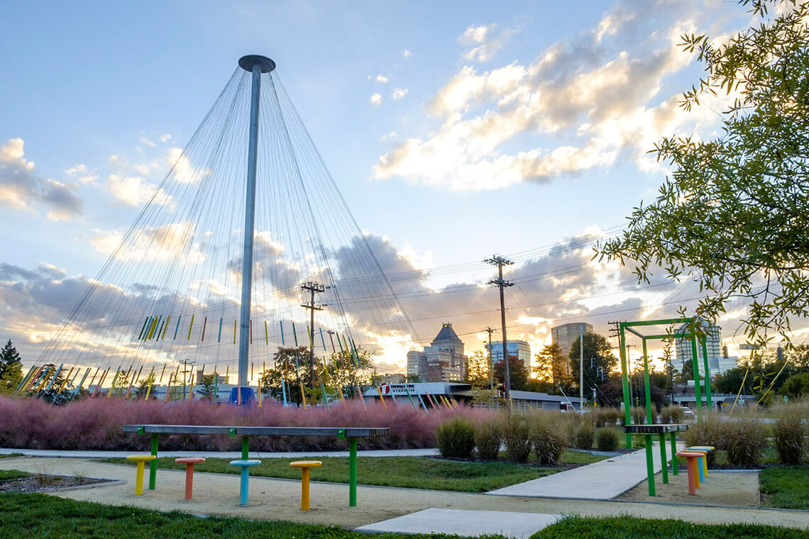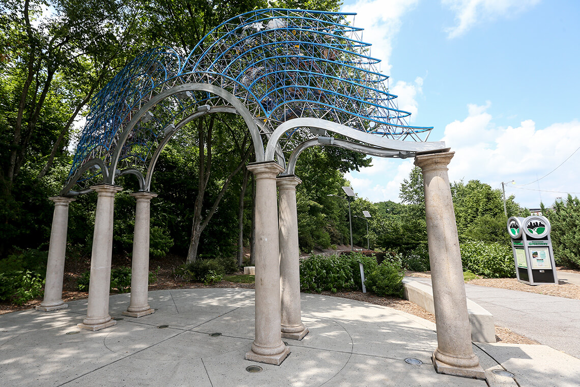 Eastern Way runs along Murrow Boulevard from the “Woven Works Park” sculpture all the way down to “Ascension,” the piece of public art at the southeast cornerstone. “When I first moved to Greensboro, you would never walk along that part of road because there was no sidewalk, a six-lane divided highway, and no landscaping,” Sanders says. “Today there’s landscaping and a beautiful path. Some of my favorite things about that eastern side are the incredible public art pieces that tell community stories in interesting ways.”