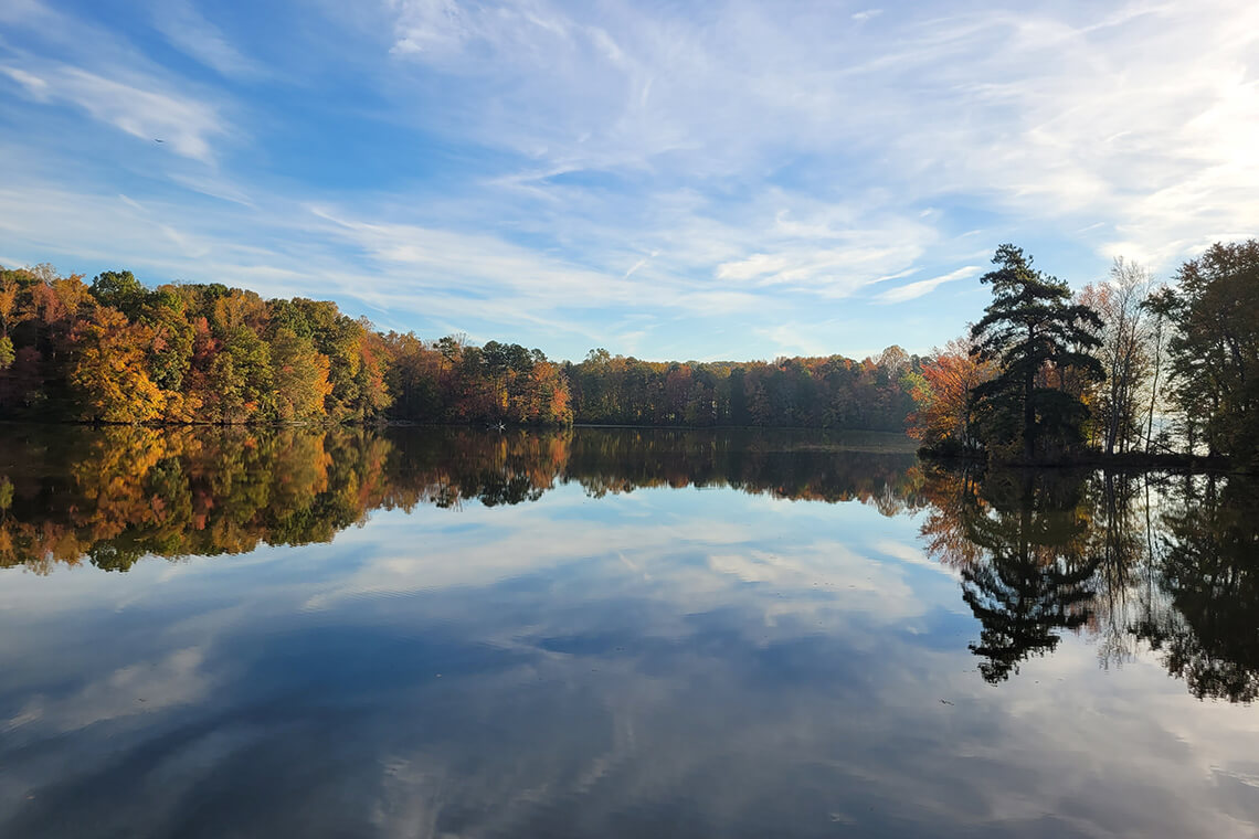 For a tranquil route, follow the Wild Turkey Trail, which rewards hikers with views of Lake Brandt. Photography courtesy of Greensboro Parks & Recreation