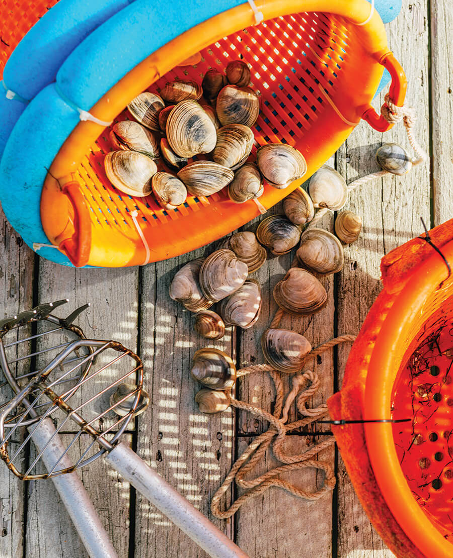 All you need to try your hand at clamming is a keen eye to spot clams tucked in the eelgrass, a rake to dredge the sandy bottom of the sound, and a basket to collect your findings. photograph by Baxter Miller