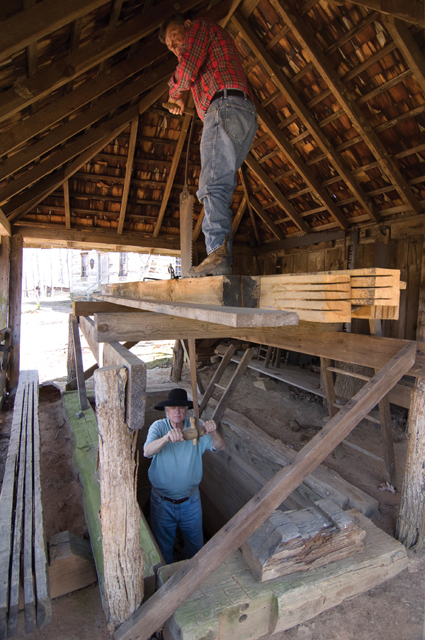 Brad Dozier “in the pits,” the saying’s exact origin. Bob steers the tiller, while Brad pulls down on the box. Wedges are placed in the kerf to keep the saw from binding. A preferable pit saw is tapered on the backside to further reduce binding. The boards are separated once all the cuts have been made; otherwise, the sawyer would have a decreasing place to stand.