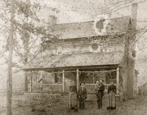The house at its original location in the late 1800s with Kahill family members: Grandma Kahill, Dan Kahill (who came to the United States at age fifteen from Ireland), Ramond Kahill holding son Serley, and Maretta Hilton Kahill. A wisteria vine winds across the porch.