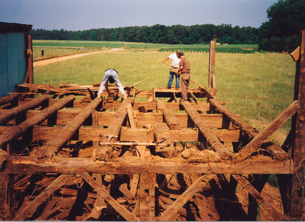 Dismantling the mortised and pegged timbers of the cotton house on the Holstein family farm outside Ridge Spring, South Carolina.