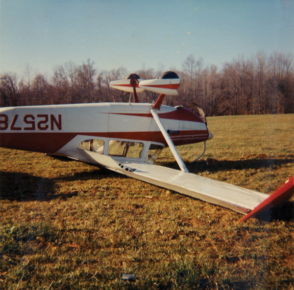 Bob Hart’s Cessna 170 as it came to rest after an engine failure over Sumter National Forest. Bob, Becky, and the boys landed hard in a small field. The plane flipped when Bob slammed on the brakes to avoid a wall of trees. Bob cites the adage, “Any landing you walk away from is a good one.”