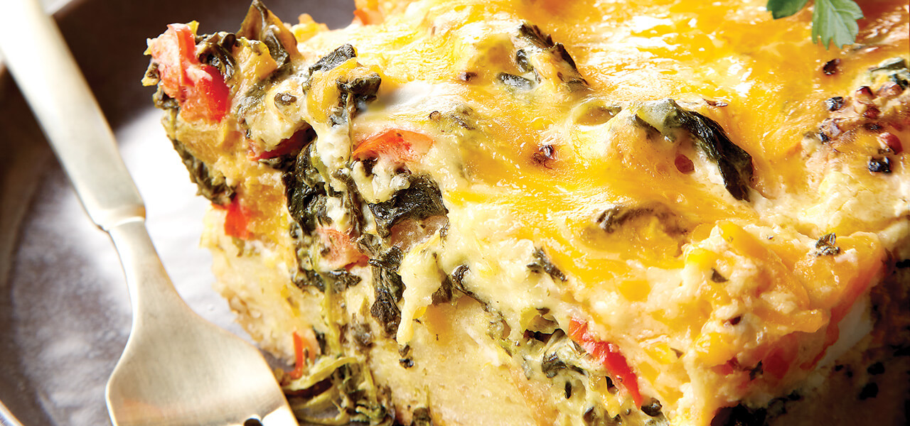 In a separate bowl, whisk together eggs, nutmeg, dry mustard, salt, pepper, and evaporated milk. Pour egg mixture over vegetable mixture. Cover with foil; refrigerate overnight.