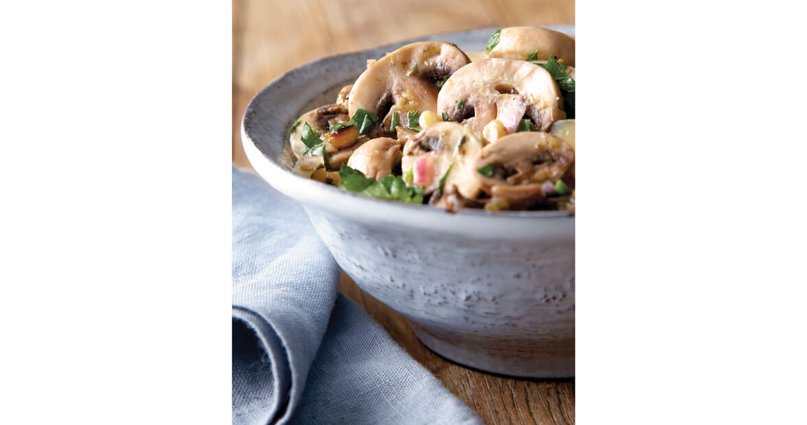 Just before serving, toss mushrooms again, season with salt and pepper to taste, and garnish with Parmesan and pine nuts.