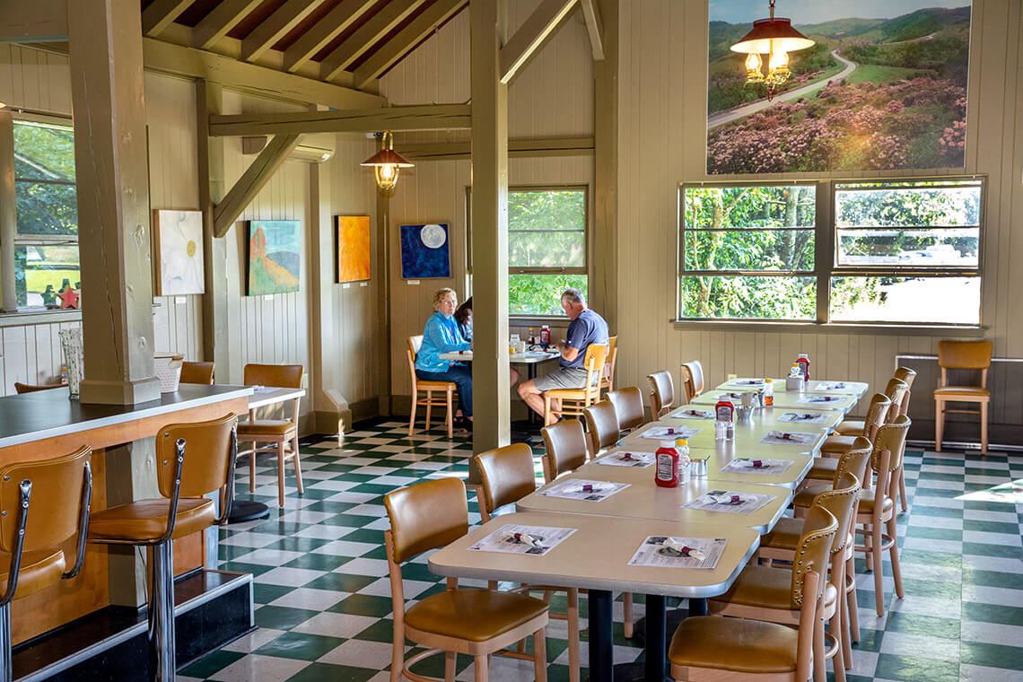 The Bluffs Picnic Area within Doughton Park (which opens for the season on May 13) was one of the first picnic areas on the Blue Ridge Parkway and is a picturesque spot to take in a beautiful view. Stretch your legs, then grab a bite to eat at the Bluffs Restaurant. Opened in 1949, it was the first restaurant on the parkway. Pair the restaurant’s famous fried chicken with sides like collard greens, cathead biscuits, mashed potatoes, and something sweet, like blackberry peach cobbler.