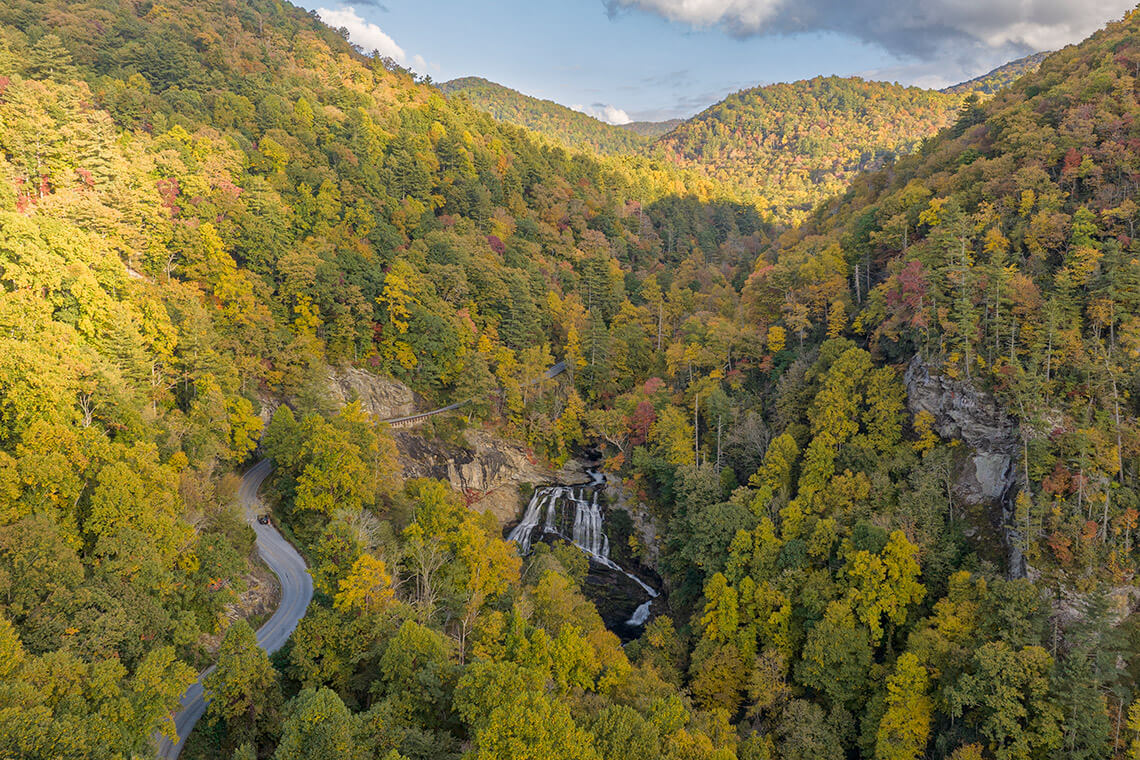On Jackson County’s stretch of Blue Ridge Parkway, spend a leisurely day driving the picture-perfect mountain contours enrobed in showy fall colors. The 1.5-mile loop trail at Richland Balsam Overlook, the highest point on the parkway, leads through spruce-fir forest to the 6,410-foot summit. After taking in the striking scenery from Waterrock Knob’s parking lot, make the moderately strenuous hike up for views from its peak. Caney Fork Overlook, Cowee Mountain Overlook, and Balsam Gap are among the other resting places to admire the captivating scenery.
