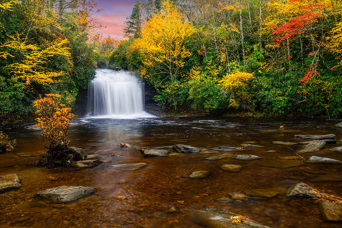 In Jackson County, you can also view one of the highest waterfalls east of the Rockies, Whitewater Falls. To reach an overlook platform, you need only walk a quarter mile on a shady, paved path. Water plummets 411 feet down the rocky cliff in striking contrast with the vibrant yellows and oranges of the surrounding woodlands.