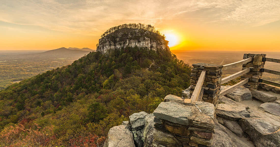 This shaded stone overlook at the end of a short path reveals vistas that include Saddle Mountain and the distant dome of Pilot Mountain. As the story behind the overlook’s name goes, hunters used to relax fireside here while their hounds hunted. According to legend, their discerning ears could distinguish the dogs’ yelps echoing through the valley, telling them whose pup was closest to catching a fox.