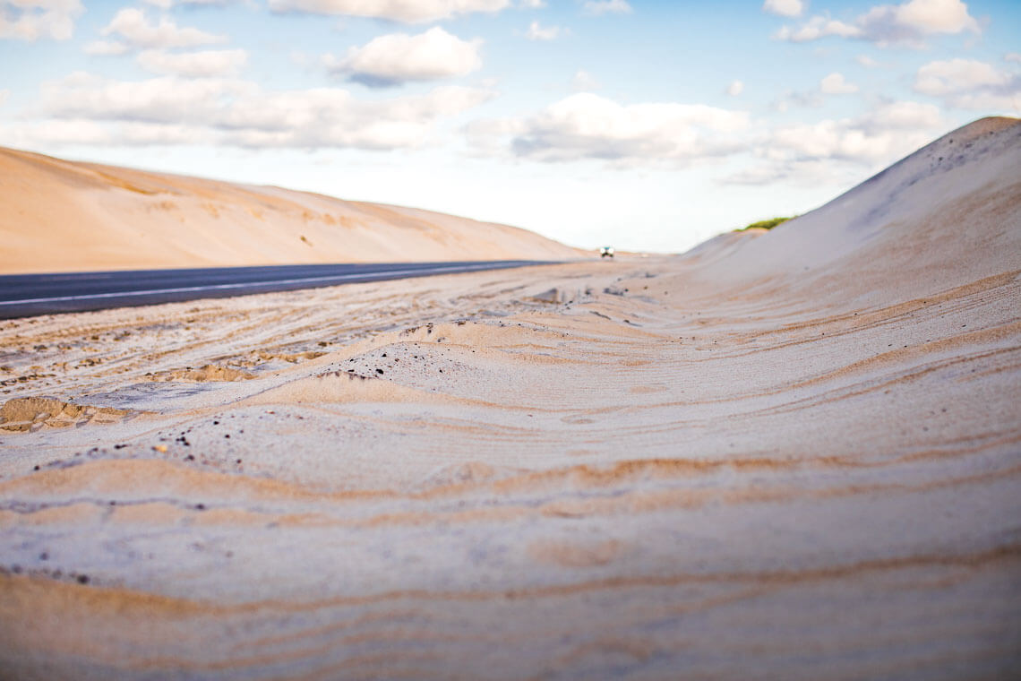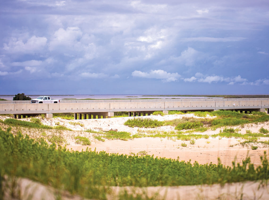 “The sand wants to migrate into the road,” says Jerry Jennings from the back of the pickup truck. It’s a bit of an understatement. Jennings, who retired in June, is the former division engineer who covered the Outer Banks for the North Carolina Department of Transportation. The second the truck cluh-clunks across the last expansion joint on the Marc Basnight Bridge, the sand is there, creeping, millions of grains at a time, toward the white line along the shoulder of NC Highway 12. It moves, on breezy days, an inch or so at a time, and it’s not long before the sand is across the white line. A 45-mile-per-hour speed limit makes it dance across the asphalt every time a car or semitruck rolls past. At night, the headlights illuminate a tan haze, each grain a prism that reflects and scatters the light.