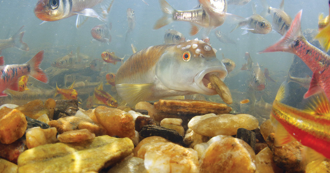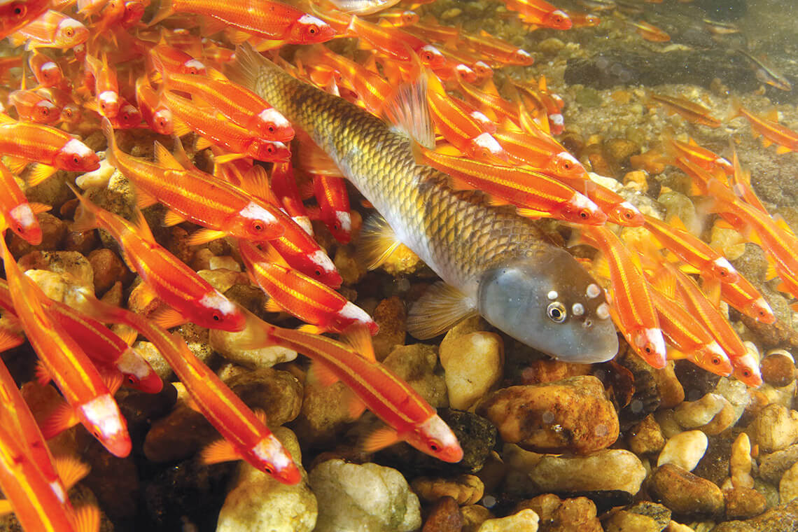 After male bluehead chubs complete their rock mounds, they cover fertilized eggs with a protective layer of gravel. They’re often joined by a community of fishes — including yellowfin shiners — that take up residence around the nest. photograph by Todd Pusser