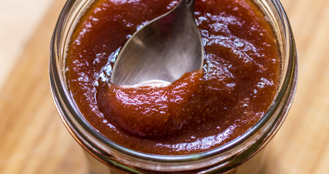 Stir well to incorporate all flavors. Place sauce pot over very low heat and let simmer for about 6 hours, stirring as needed to keep from burning. Mixture will thicken over time and splatter if not watched carefully. As it thickens, place a spoonful on a saucer that has been kept in the freezer. Swipe your finger through the butter to see if it will leave a trail or if it runs back together; if it leaves a trail it’s ready.