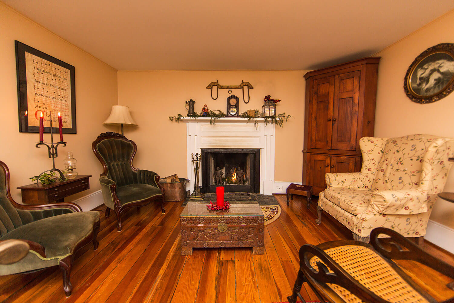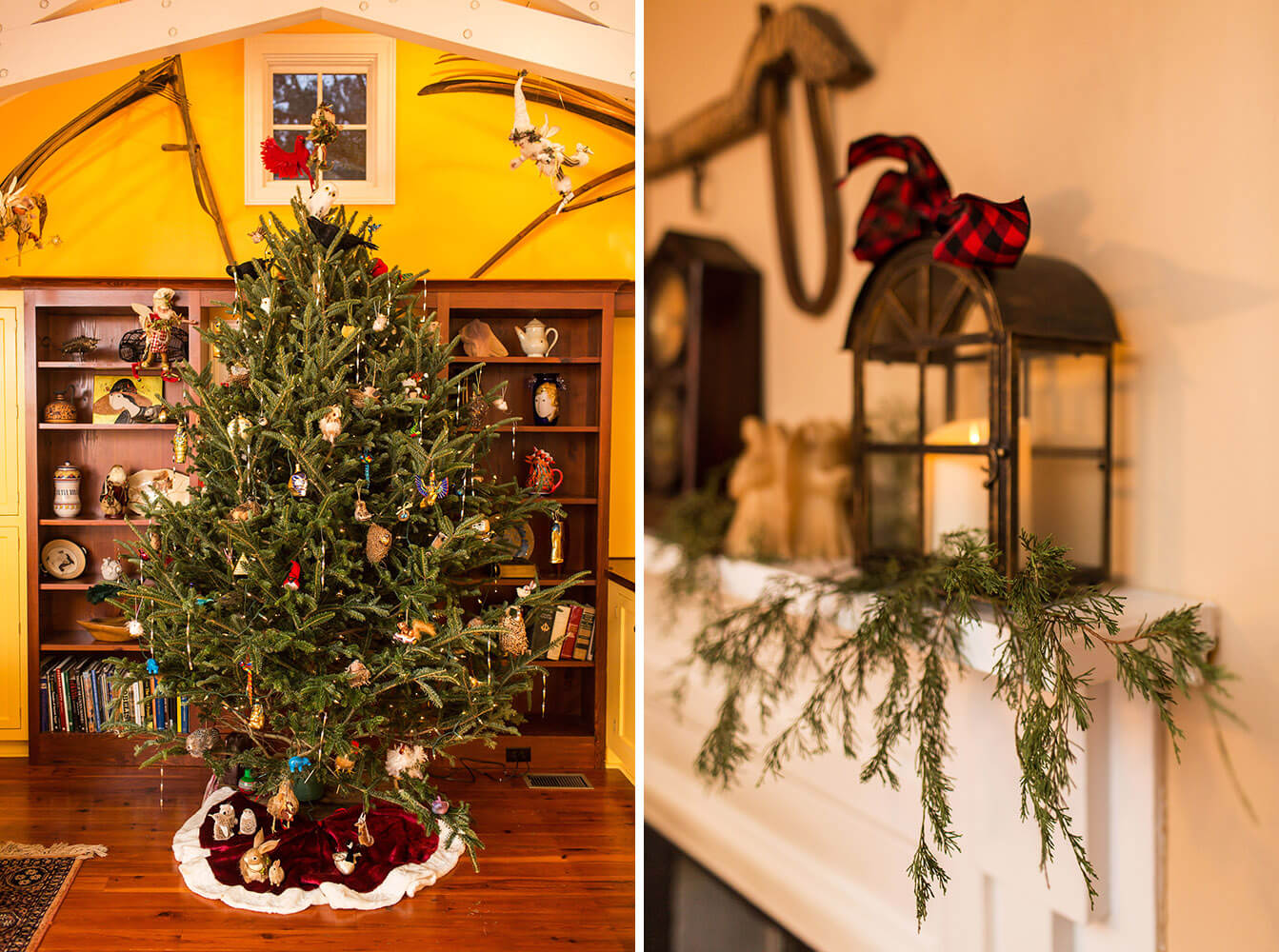 During the holidays, they gather pine boughs and other greenery from the woods and use them to grace the banisters and mantels. They put candles in each room, the flames dancing delicately and casting shadows against the walls. The Christmas tree, with its modern ornaments and lights, is relegated to the gathering room, the newest part of the house.