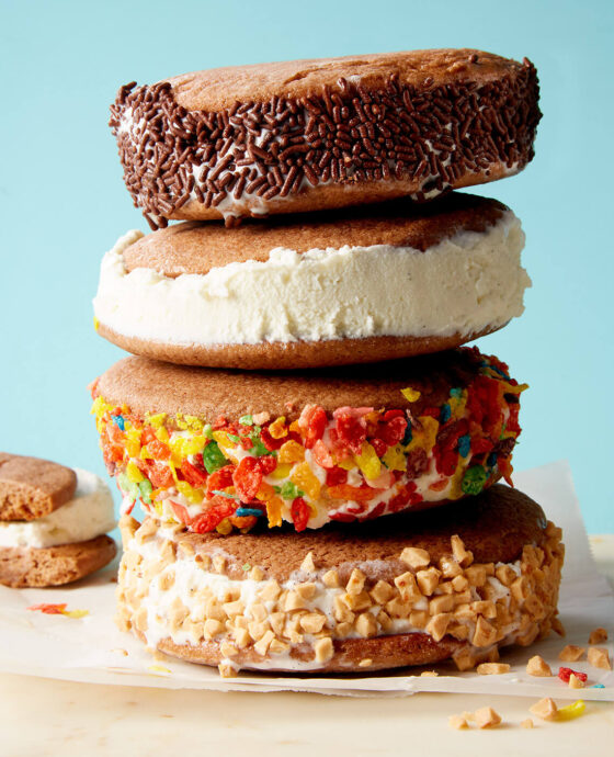 To assemble: Remove ice cream from freezer, unwrap, and invert onto a cutting board; remove pan and peel off plastic. Working quickly, press 4-inch round cookie cutter straight down into ice cream. Working with 1 round of ice cream at a time, use a thin metal spatula to place it on a flat-side-up cookie and top with a right-side-up cookie. Transfer sandwiches to a rimmed baking sheet set in the freezer as you work. Roll sides of sandwiches in sprinkles, chopped nuts, chopped chocolate chips, or colorful cereal, depending on flavor of ice cream. Freeze sandwiches until ice cream is hard, about 2 hours. Cover sandwiches with plastic wrap and freeze overnight.