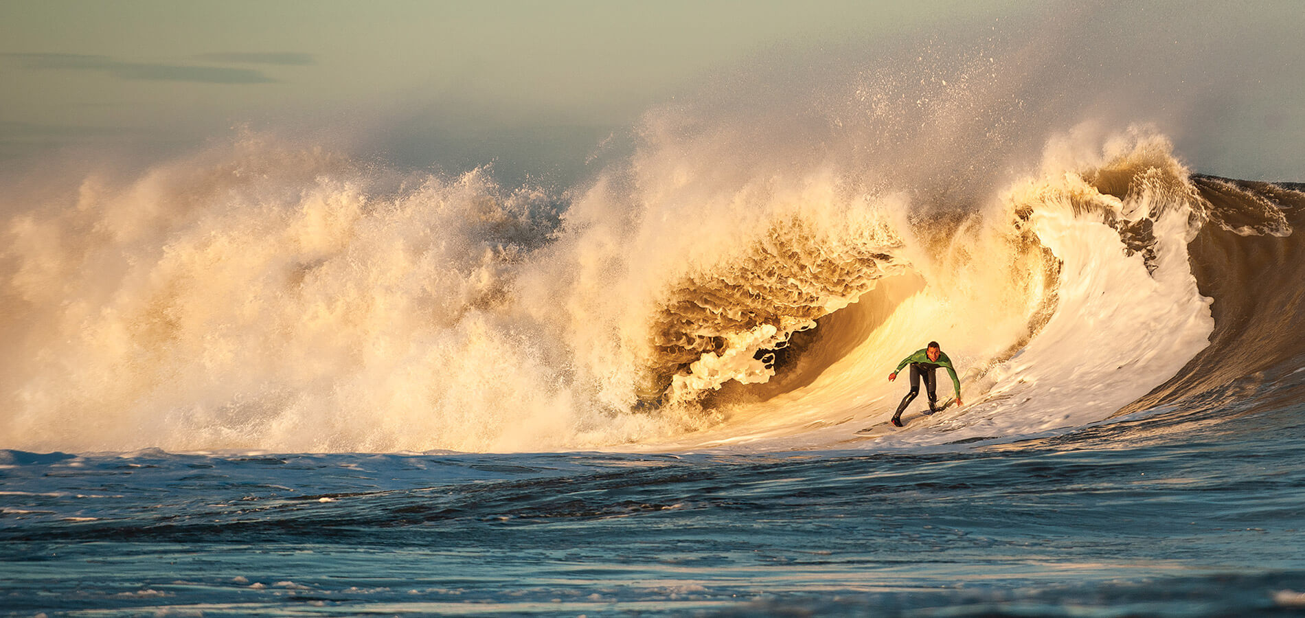 Rodanthe’s location near the continental shelf means a sudden and dramatic increase in the ocean’s depth, which results in a powerful beach break — and a stellar ride for surfer Michael Dunphy. photograph by Daniel Pullen