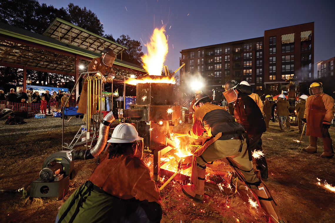 A flame shoots from a furnace like a jet engine cutting through dusk. Each November, metalworkers from across the state gather around furnaces set up in Durham Central Park for the annual Iron Pour, a fundraiser for Liberty Arts. Teams load iron into the flames — roaring at about 3,000 degrees — and pour the molten metal into molds to create cast-iron works of art.