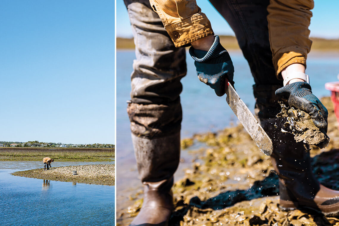 Using a homemade tool she calls a “cluster buster,” Shellem separates wild oysters that grow in clumps. photograph by Matt Ray Photography