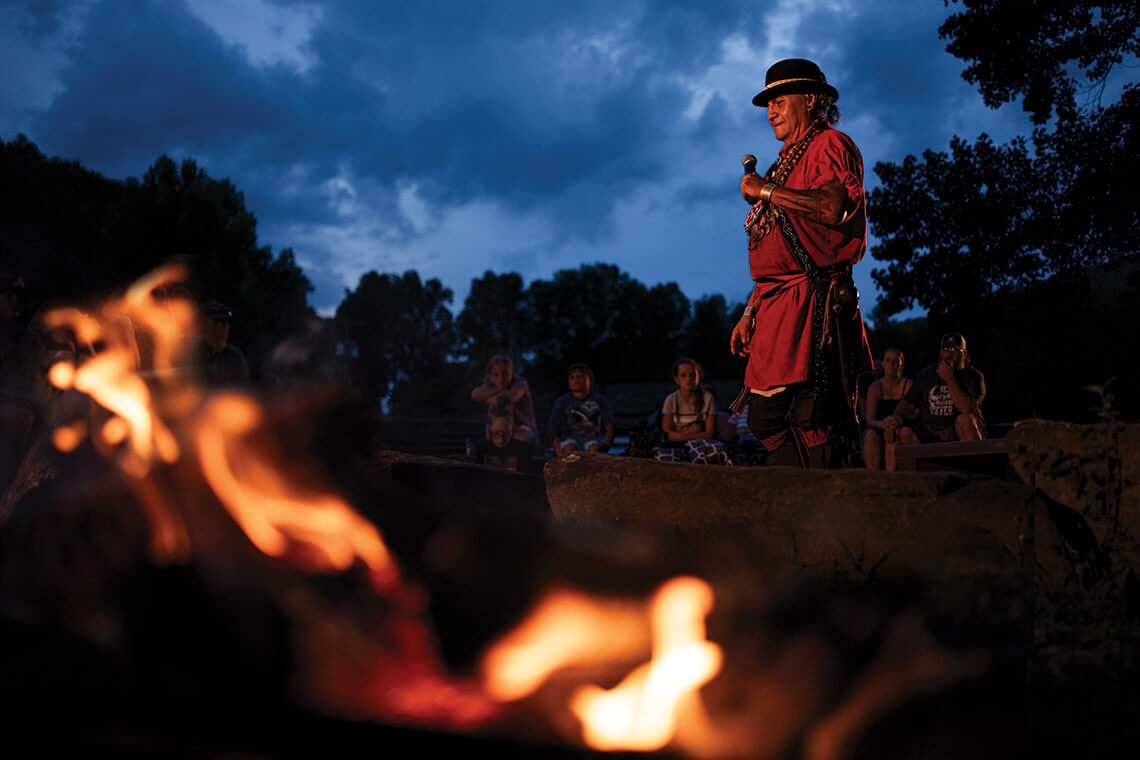 On Fridays and Saturdays from June to October, storytellers like Sonny Ledford share Cherokee traditions (and marshmallows, too) at Oconaluftee Island Park. photograph by Derek Diluzio
