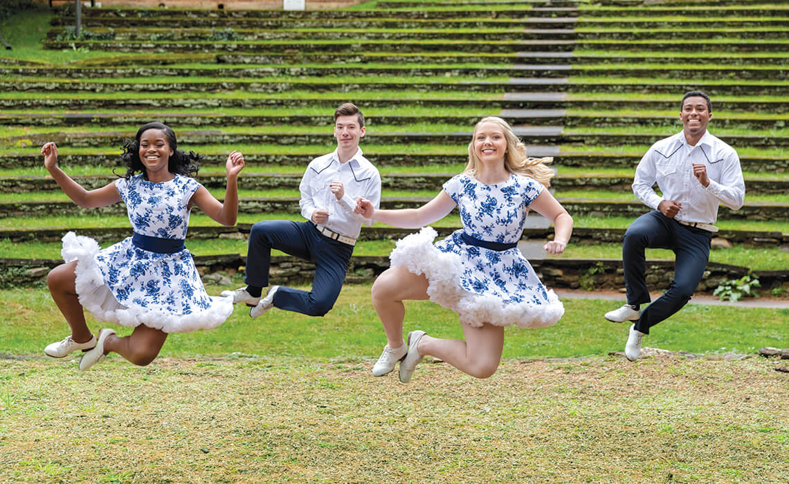When the Bailey Mountain Cloggers — including (above, left to right) Tykasia Davis, Bailey Clayton, Rachel Sealy, and Enrique Rodriguez — perform “precision” clogging, they dance as one, the metal taps on their shoes punctuating each movement in unison. “Freestyle” means that everybody’s doing something different. For a “big circle smooth” dance, they wear soft shoes to glide across the floor. These styles and many more are woven into BMC’s repertoire, which blends old and new to keep mountain dance traditions alive. Students at Mars Hill College (now University) founded the team in 1974, paying homage to a local squaredancing group started by musician and folklorist Bascom Lamar Lunsford in 1950. Today, BMC is one of only a few competitive collegiate clogging teams, often traveling internationally to learn the dance traditions of other countries, spread the word about clogging, and serve as ambassadors of Southern Appalachia.