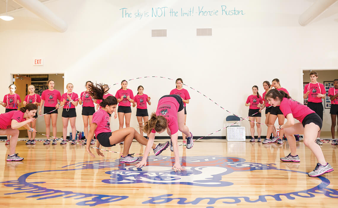On the border of Durham and Chapel Hill, the Bouncing Bulldogs learn fancy footwork and life lessons inside the world’s first gym built just for jumping rope. Coach Ray Fredrick Jr. started the not-for-profit competitive jump rope team in 1986 while teaching physical education in Durham. Together with a handful of Bulldog alumni turned coaches, he helps 160 boys and girls, ages 5 to 26, learn synchronized skills, acrobatic maneuvers, and dance moves — all while jump ropes whiz around them. The team travels the world, winning awards with skills like “Subway” (pictured above): As Shalini Stockmans (left) jumps on her back, Jenna McKee (center) moves over her while jumping in a pushup position, and Anna Furlong (right) turns the double Dutch ropes. Over, under, up, and down, the Bulldogs move together, as a team.