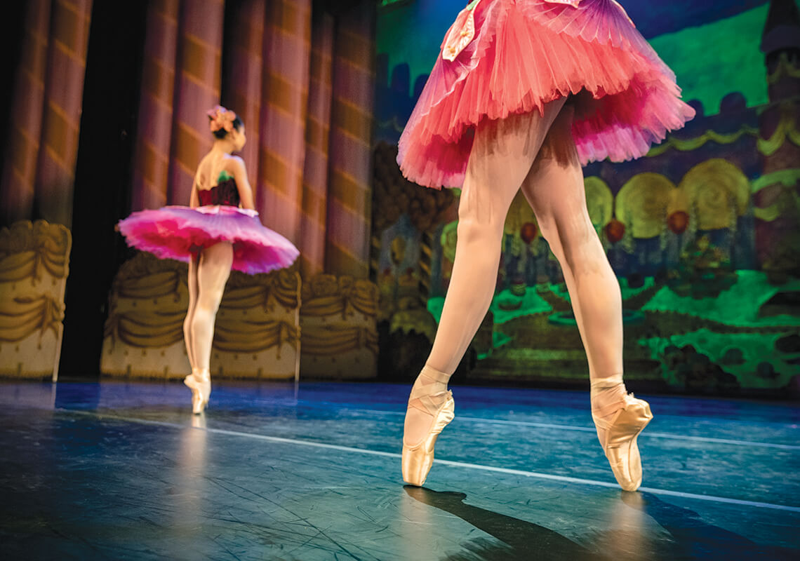 Carolina Ballet’s 42 dancers — including Matilda Solis and Anna Ingold, in costume for the “Waltz of the Flowers” in The Nutcracker — come to Raleigh from around the world, having trained at the most competitive level to tell stories en pointe. photograph by Charles Harris