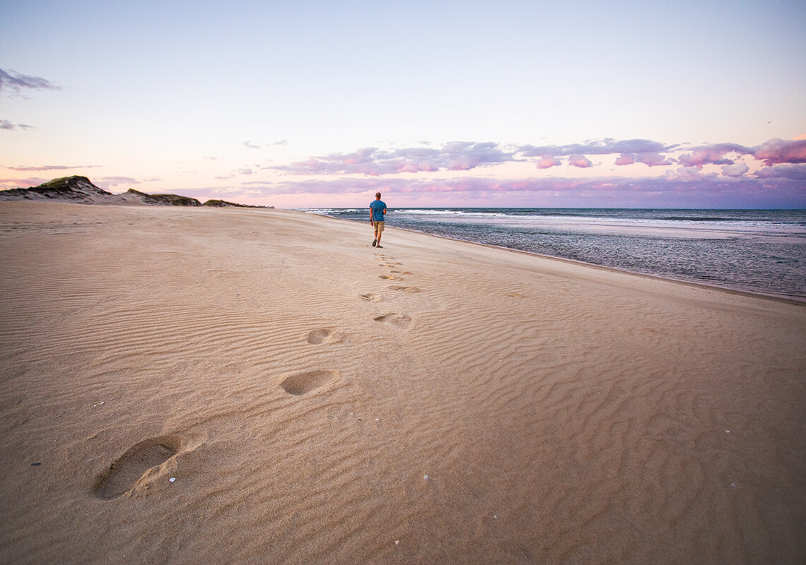 To walk barefoot on the eastern edge of our state, sinking into the sand where the land meets the vast Atlantic, is to become one with North Carolina. Ahead, the wide-open beach unfurls, inviting quiet reflection. Behind, the tide washes away our tracks, creating the beach anew. A walk on an undeveloped stretch like Coquina Beach (pictured above), eight miles south of Nags Head, is a reminder: Exploring our wild, wonderful state on foot is good for the soul.