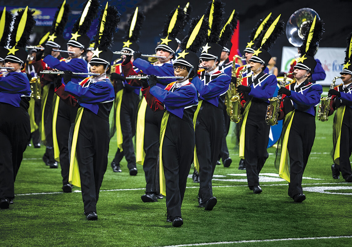 In November 2019, West Carteret High School’s Marching Patriots competed in the Bands of America Grand National Championship in Indianapolis, performing a show called “Cirque Nouveau.” photograph by TONY MCCRACKIN