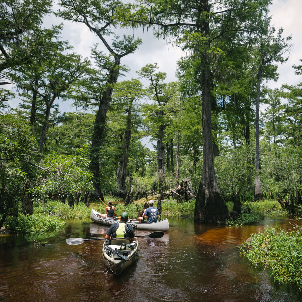A flittering glint of yellow catches my eye, and I follow it into the trees — a prothonotary warbler is tending its nest. It’s one of my favorite birds, a tiny, swamp-dwelling migrant that takes over the nesting cavities left by woodpeckers. Seeing it brings to mind the ivory-billed woodpeckers that once thronged these forests, and the Carolina parakeets that might have nested in their hollows. And it brings to mind this: Many of the trees here must have witnessed those long-vanished species. They would have nodded over Native Americans in dugout canoes. They would already have been tall when the Lost Colony was lost, when the Mayflower sailed, when Attila the Hun was on the move. A few might have stood when Christ was born.
