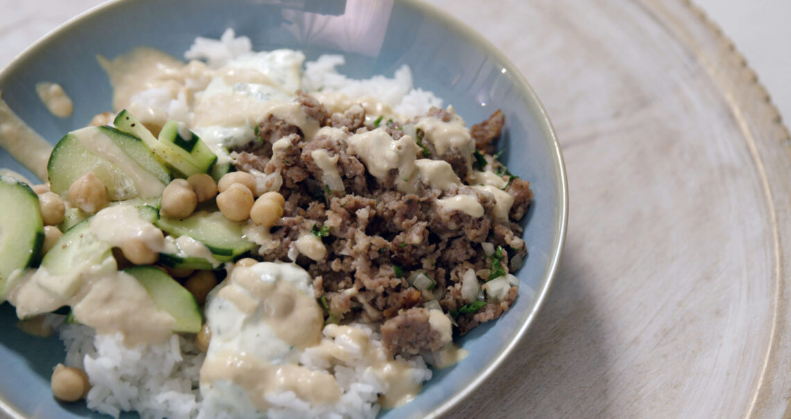To build a rice bowl, place about ½ cup of cooked rice in the bottom. Arrange the sausage mixture on one side and the cucumber salad on the other. Drizzle with yogurt and tahini sauce and serve.
