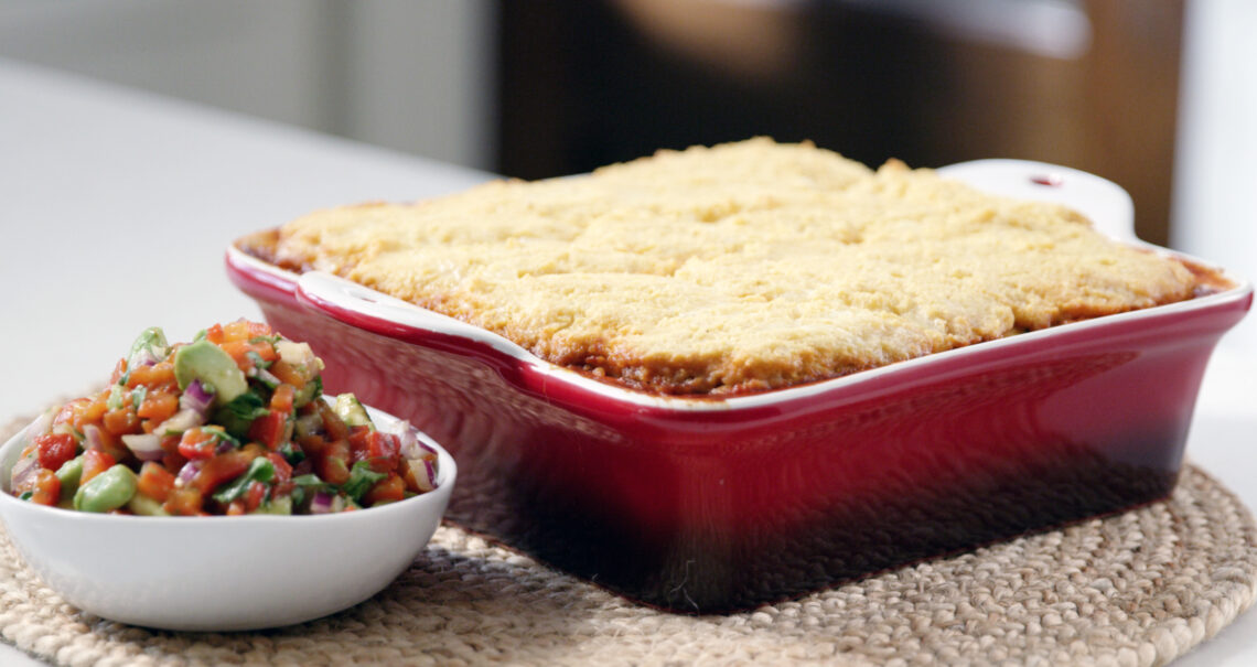 Spread the masa batter over top in an even layer; (it’s okay if it doesn’t cover the entire surface). Bake in the center of the oven until top is golden brown and bubbling around the edges, 30 to 40 minutes. Let stand 10 minutes.