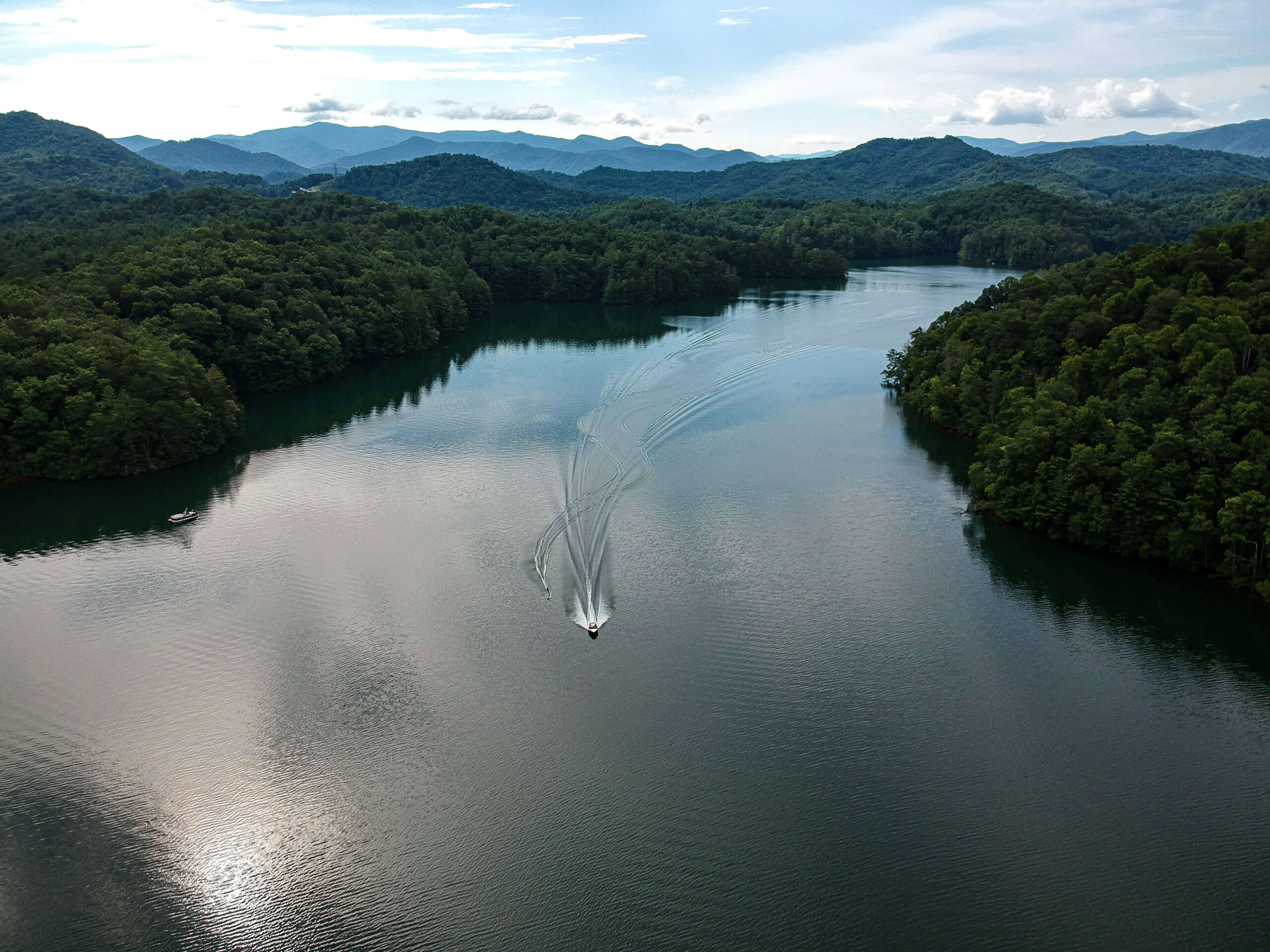At Lake Santeetlah, you can rent a boat and explore the pristine waters. From relaxing on a pontoon boat to more adventurous activities like paddleboarding, kayaking, canoeing, and water skiing, there’s something for everyone. photograph by Hunter Turner