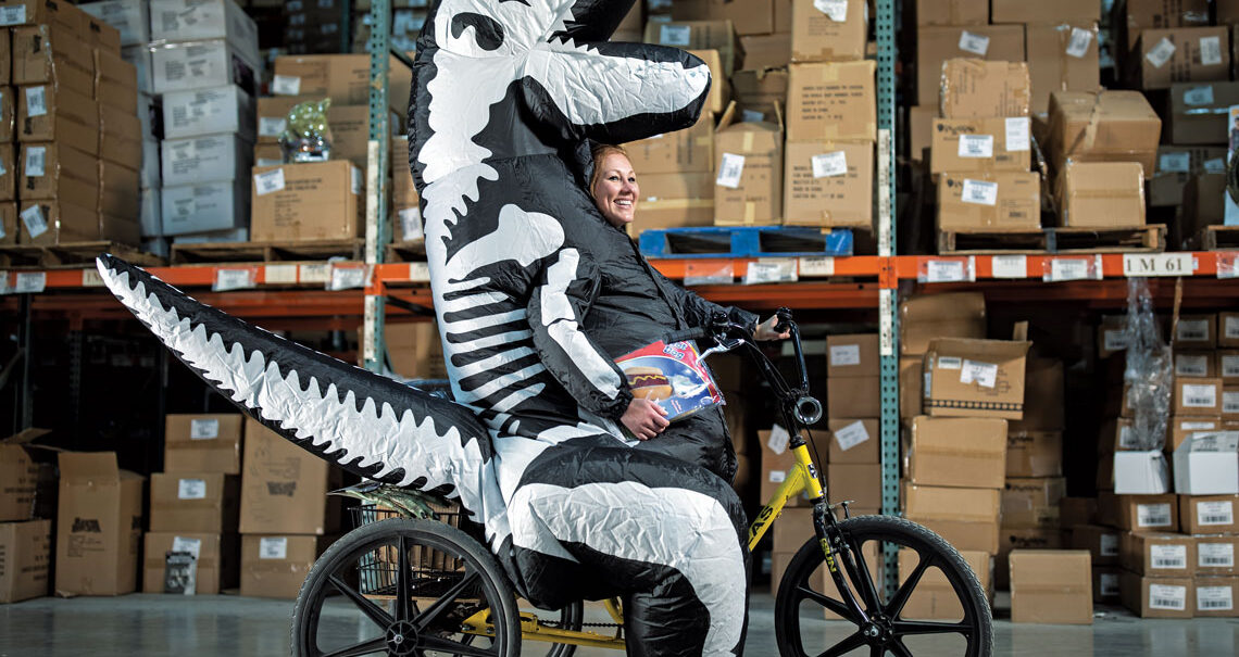 But venture inside, and you’ll discover workers fetching mermaids, cowboys, witches, superheroes, and more from shelves reaching 30 feet high. Turn one way, and there’s a cart of Santa hats. Turn another, and — boo! — there’s a seven-foot-tall mechanical dragon. What might seem like a Brigadoon of make-believe is the 300,000-square-foot distribution center for Morris Costumes, where up to 20,000 costumes ship out daily during the fall.