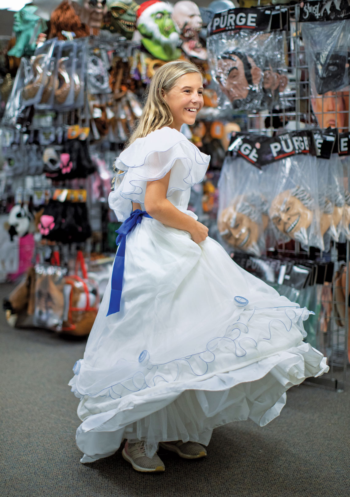 Halloween customer Maylee Stroupe tries on a costume inside Morris Costumes. photograph by Jerry Wolford & Scott Muthersbaugh